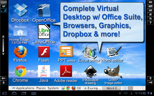 AlwaysOnPC is a ‘virtual PC-in-the-cloud’ with desktop-class apps: Run Chrome or Firefox browser with Extensions (e.g. Adblock, screenshot, etc.) JAVA-applets* & Flash Player; OpenOffice suite (LibreOffice too!), DROPBOX & more from your Android device!