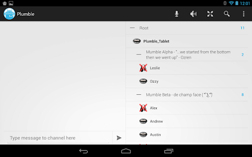 Overview: Experience Mumble servers on your Android device to the fullest with Plumble- Android's premier Mumble client. With voice activity and push-to-talk input, communicate with your friends on any Mumble 1.2+ server.
